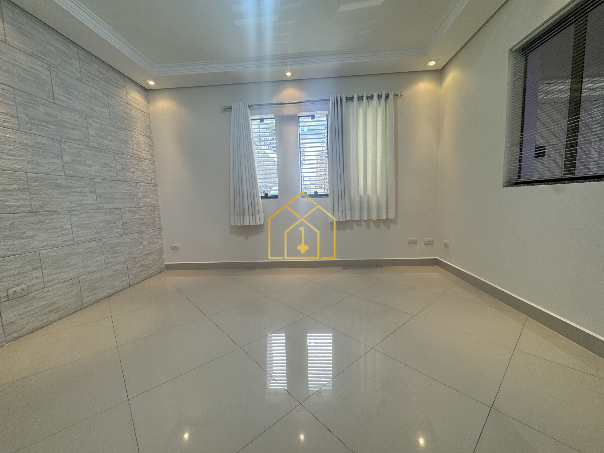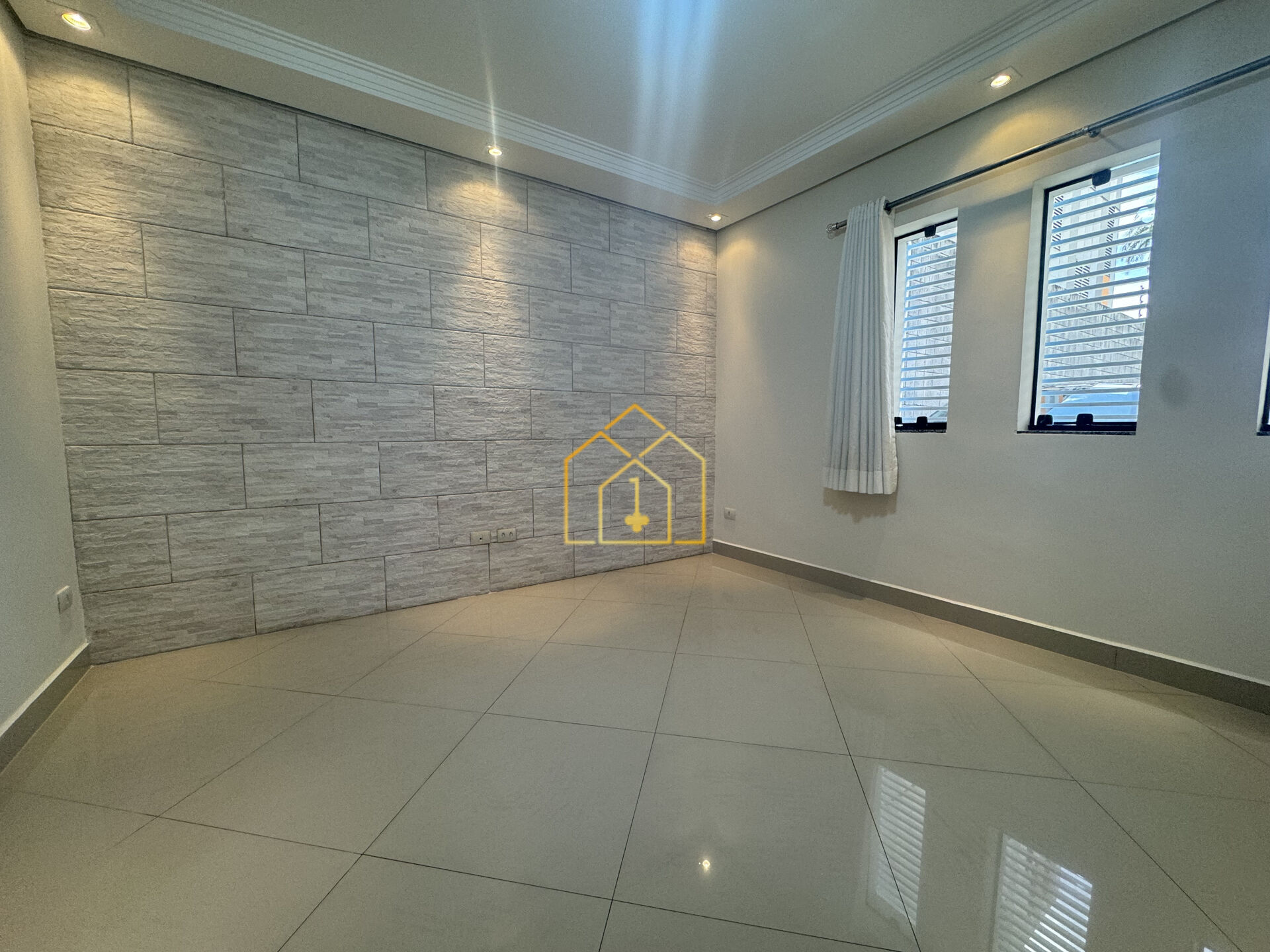 - Sala de tv: sanca em gesso, parede decorada canjiquinha, piso porcelanato;